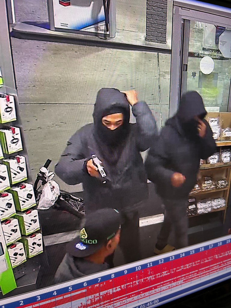 According to the store manager, the suspect holding the firearm allegedly struck one of the three store patrons present at the time of the robbery and directed them to the corner of the store. The suspect with the gun then jumped across the counter and allegedly demanded money from the cash registers.