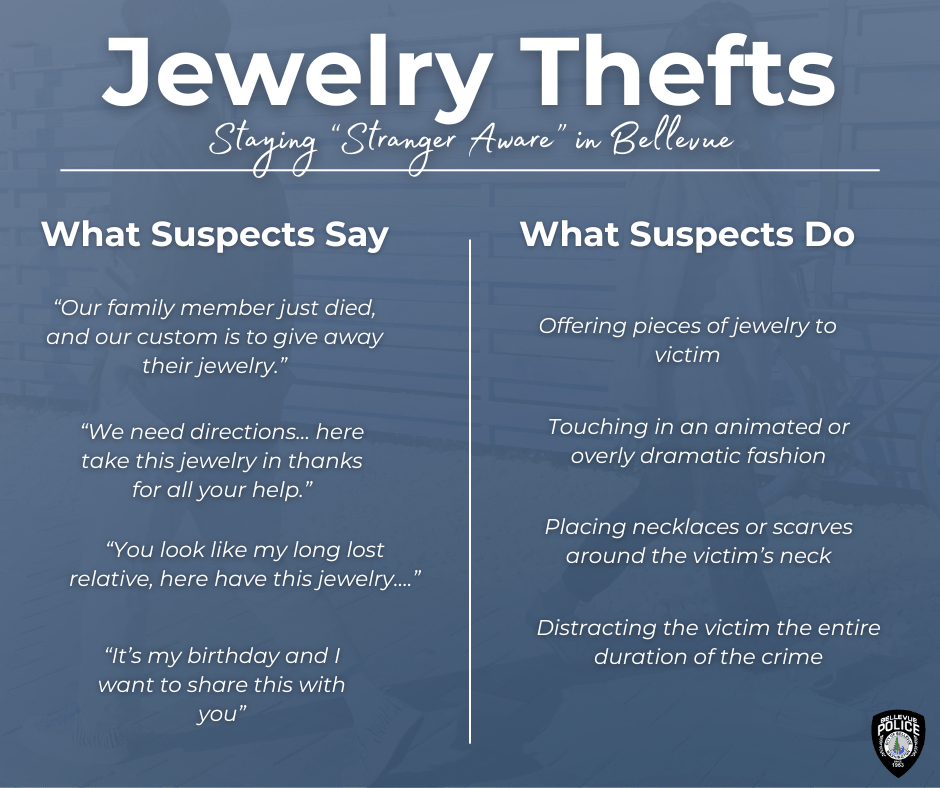 The Bellevue Police Department asked community members this week to be “stranger aware” this summer and take preventative measures that would protect themselves from jewelry theft incidents.