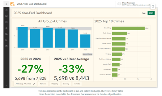 Bellevue Police reported overall crimes for the city declined 27% (5,698 crimes) when compared to 2024 (7,828 crimes). Additionally, property crimes (robbery, theft, vandalism, burglary, etc.) dropped by an unprecedented 33% (4,412 crimes) for 2025 compared to the previous calendar year (6,546 crimes).