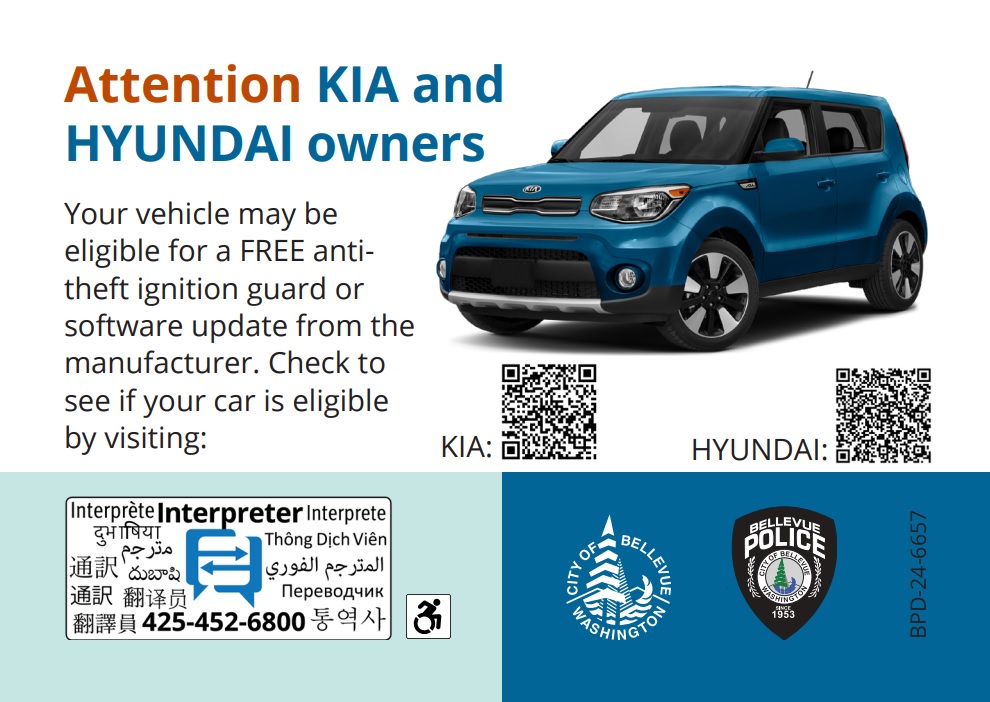 The events are part of a larger effort to reduce the number of thefts of these vehicles throughout the Puget Sound region after a popular online trend has caused thefts of KIA and Hyundai vehicles to spike. Owners of affected model year 2011-2022 Hyundai vehicles will be able to come to the events without an appointment and receive a free security software upgrade or an ignition hardware upgrade from a certified Hyundai technician. The upgrade will take about 20 minutes to complete and makes the vehicle harder to steal without a physical key present. Owners can also receive a free steering wheel lock and crime prevention information. These events are FREE and no appointment is necessary. Owners do not need to live in Bellevue or Tacoma to participate.